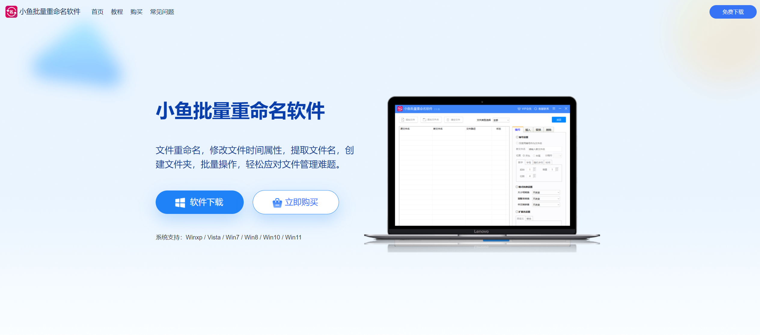 方法②:打开浏览器,搜索“小鱼批量重命名软件”官网,进入页面后,点击“免费下载”按钮,即可下载软件安装包。