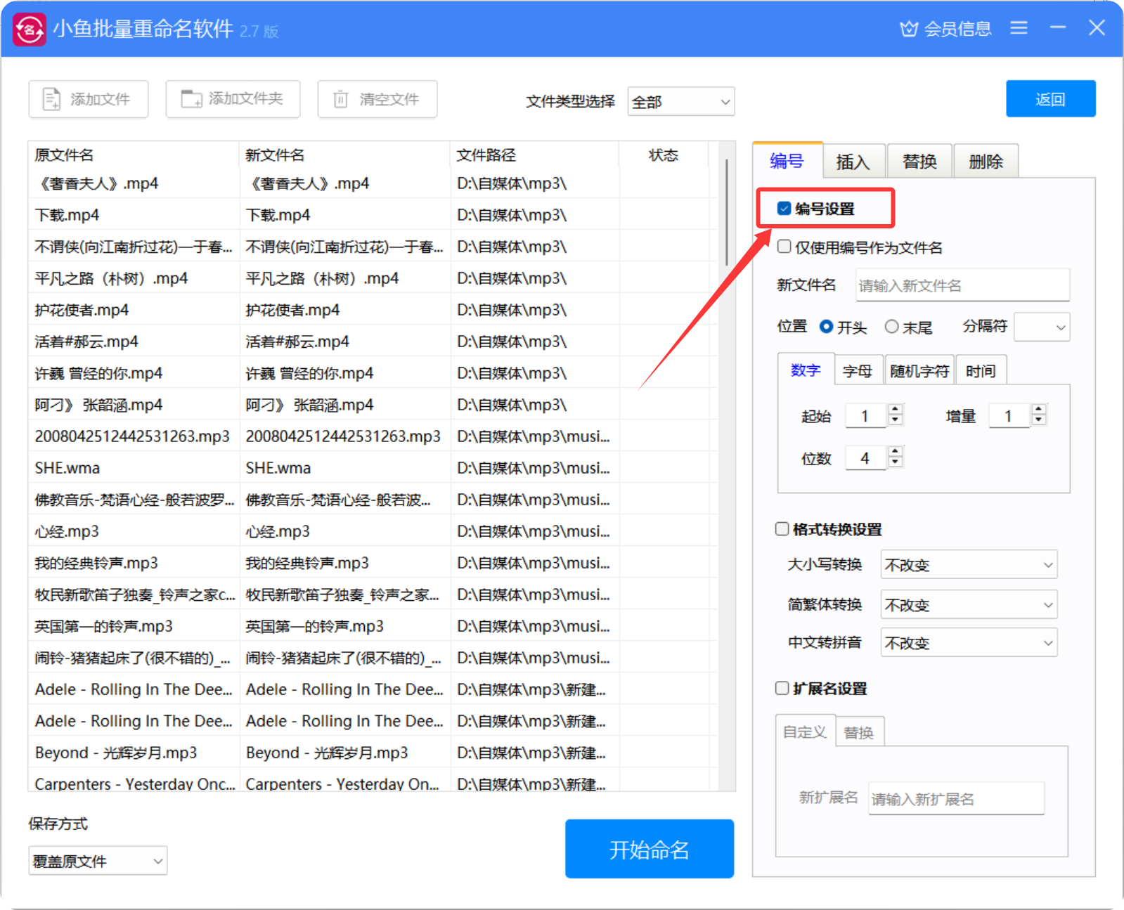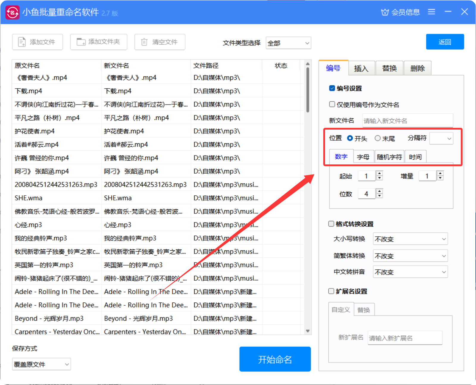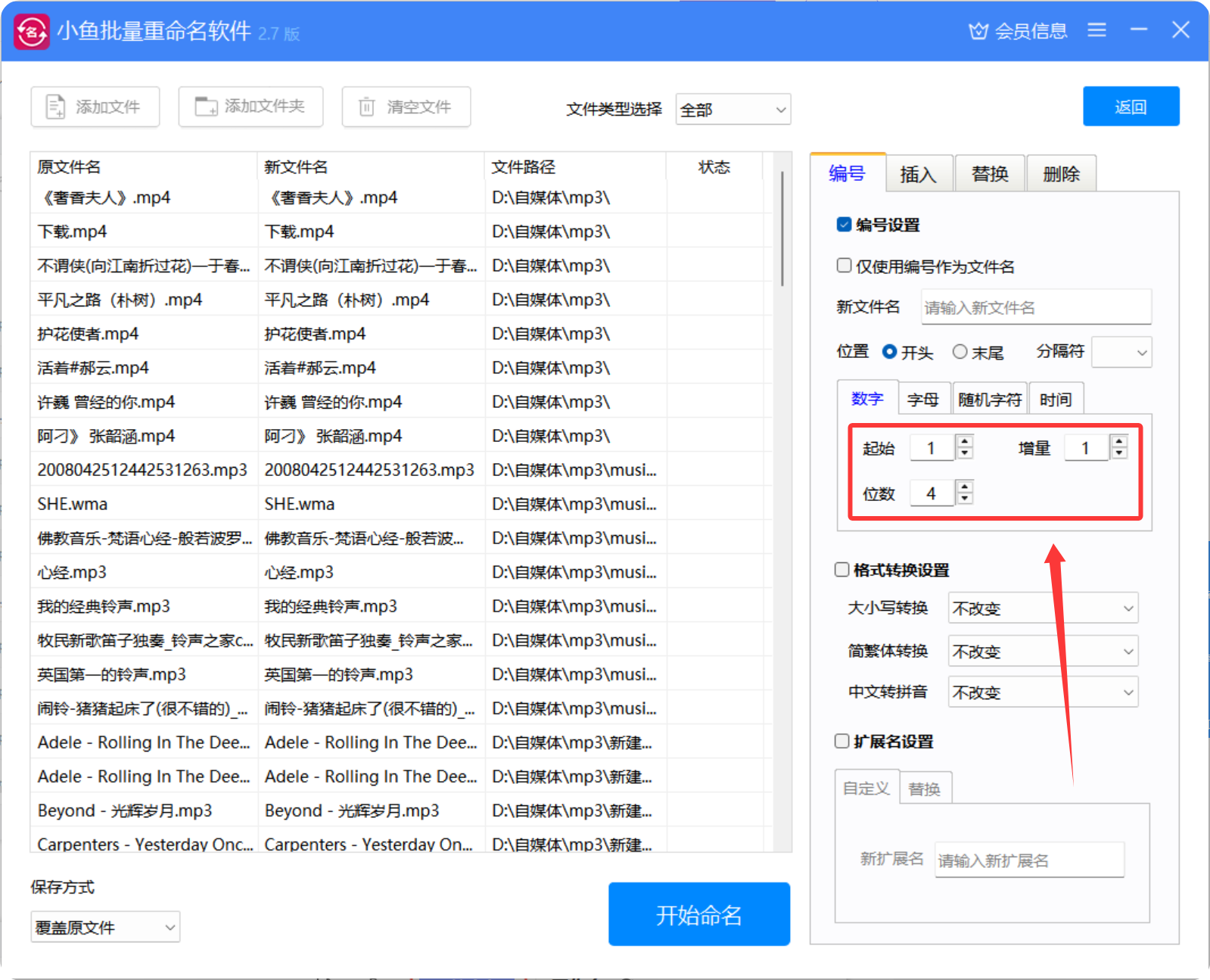 5、001有三位数,所以这里设置位数为3;小鱼批量重命名软件支持灵活调整位数,满足不同需求。