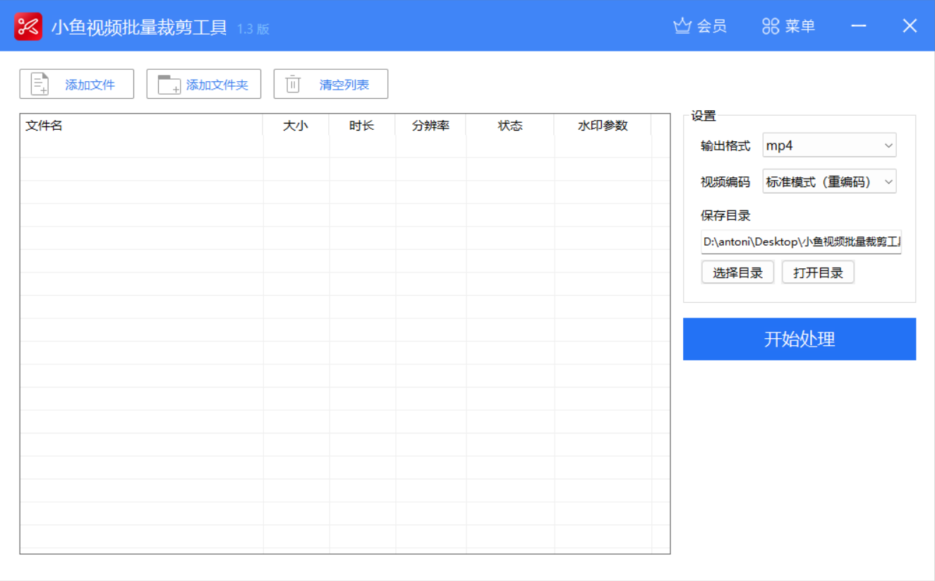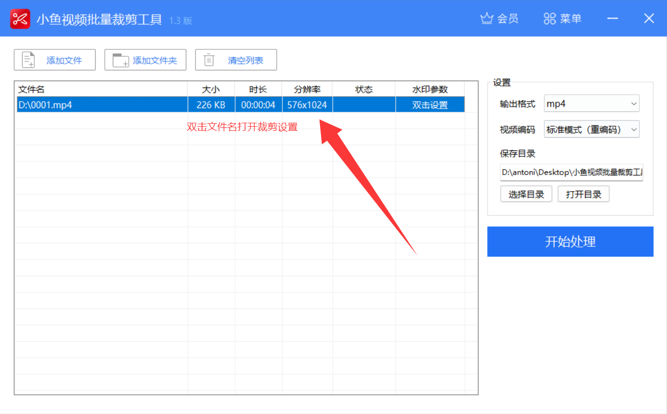 需要处理的视频文件添加完成,并设置好需要处理的视频裁剪区域后,点击右侧的“开始处理”按钮即可执行处理任务。