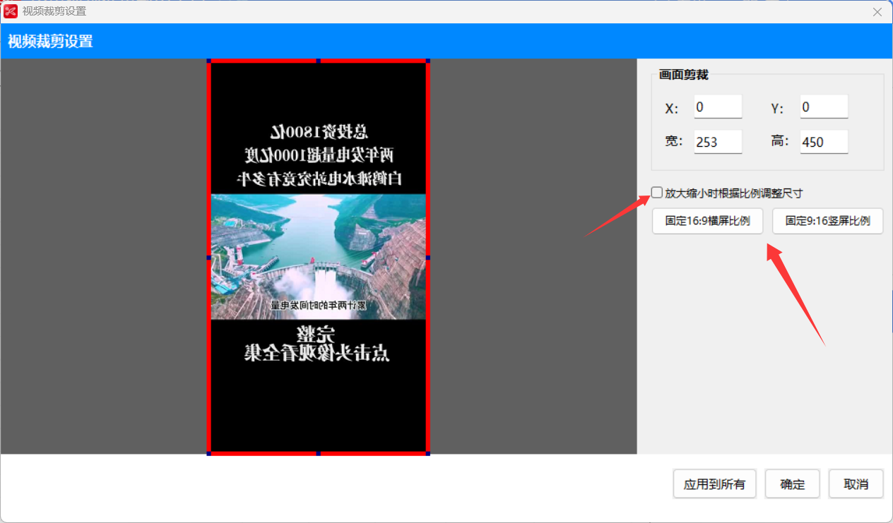 默认自由设定裁剪后的视频大小。也可根据裁剪视频的宽度与高度比例快速设定裁剪区域,以及锁定裁剪的比例。