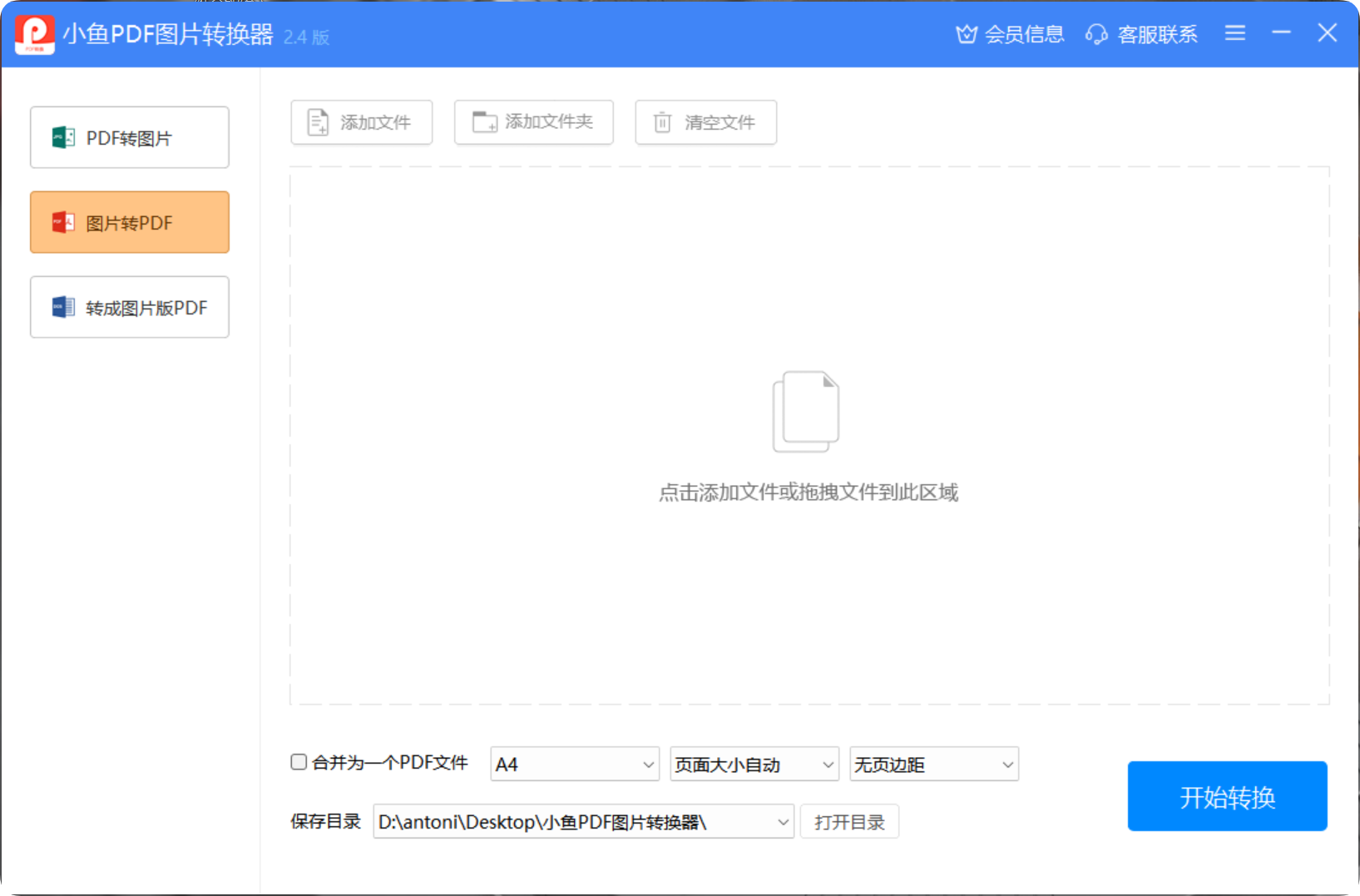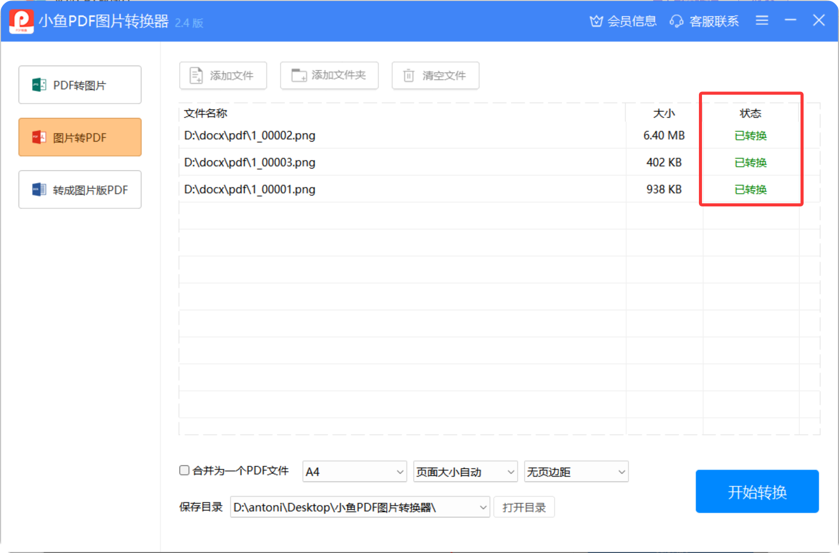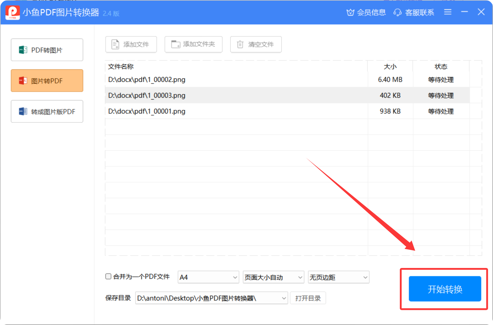 步骤5、点击"开始转换"按钮,软件将自动完成图片到PDF的转换过程。小鱼PDF图片转换器的转换速度快,效率高,即使是批量转换多个文件也能在短时间内完成。