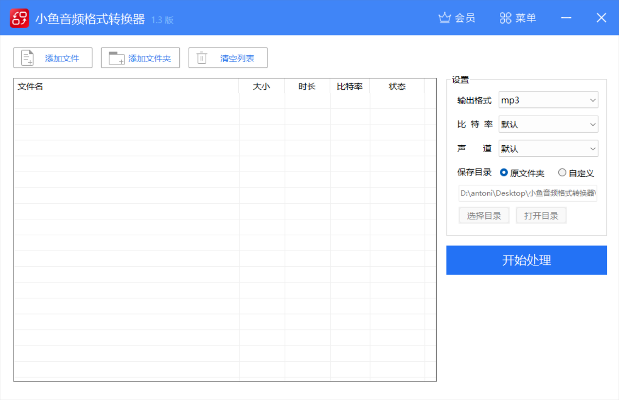 在对文件进行处理之前,我们可以设置文件的“输出格式”、“比特率”、“声道”、“保存目录”等。