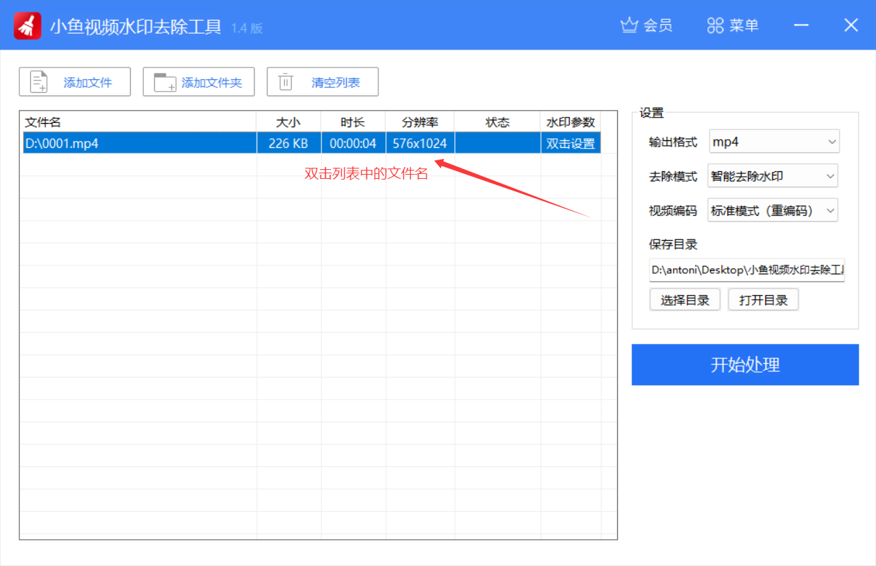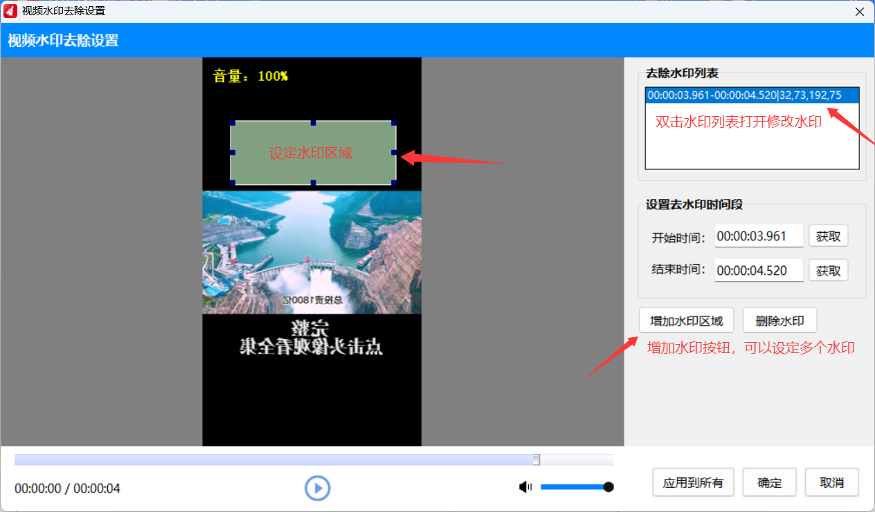 添加需要去除水印的视频后,双击列表中的视频文件名即可打开水印设定界面