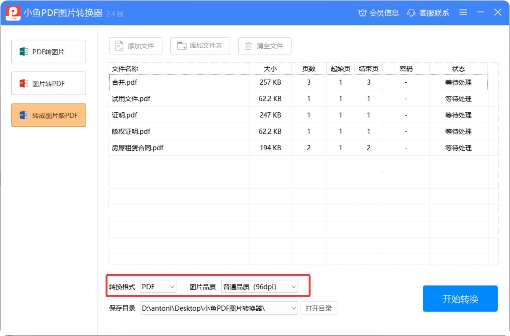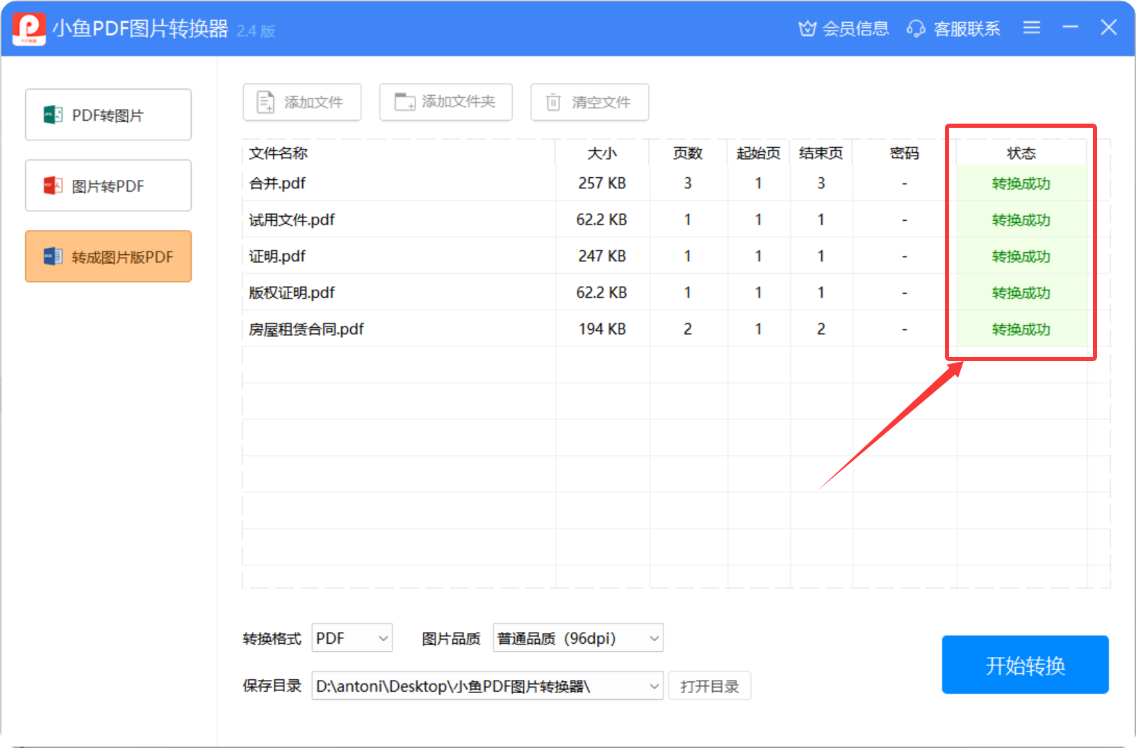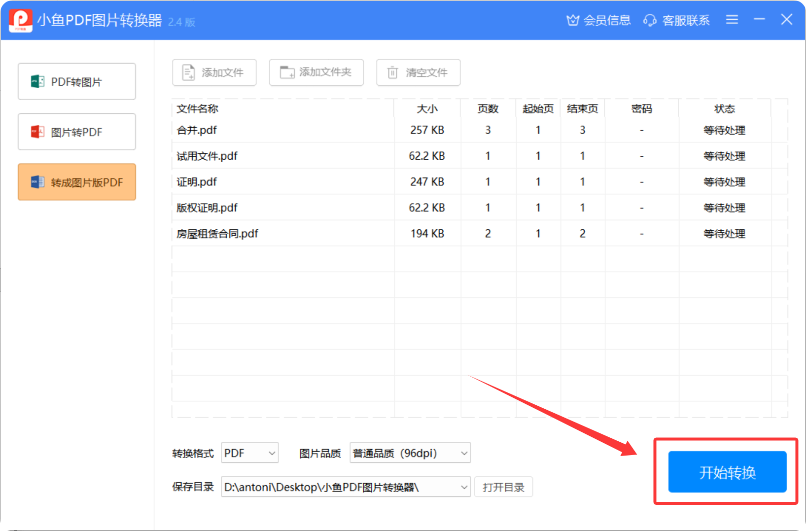 点击"开始转换"按钮,等待转换完成。小鱼PDF图片转换器支持批量处理,一次可以转换多个文件,转换过程中会自动优化排版。