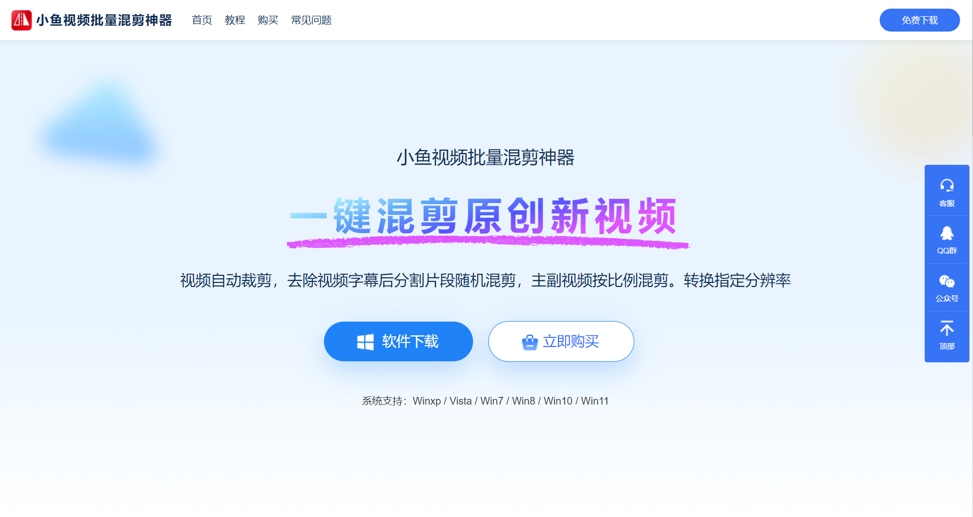 方法②:打开浏览器,搜索“小鱼视频批量混剪神器”官网,进入页面后,点击“免费下载”按钮,即可下载软件安装包。