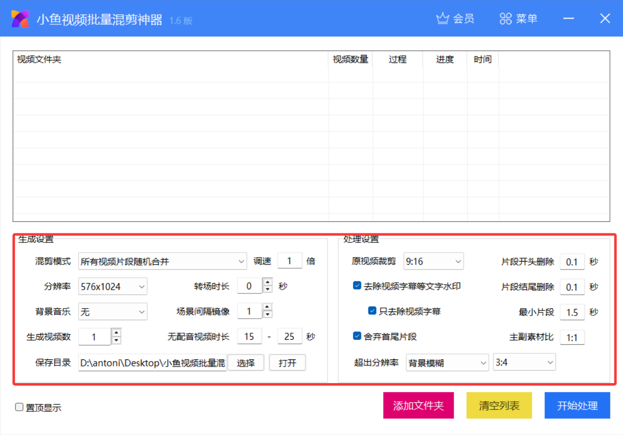 选择需要混剪的原视频文件夹(不包括子目录)。也可以直接把需要处理的多个视频文件夹直接拖到程序的文件列表框中。